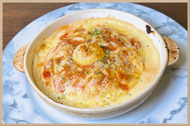 厚切りの食パンに自家製のトマトベシャメルソースとベーコン、半熟目玉焼きをのせて